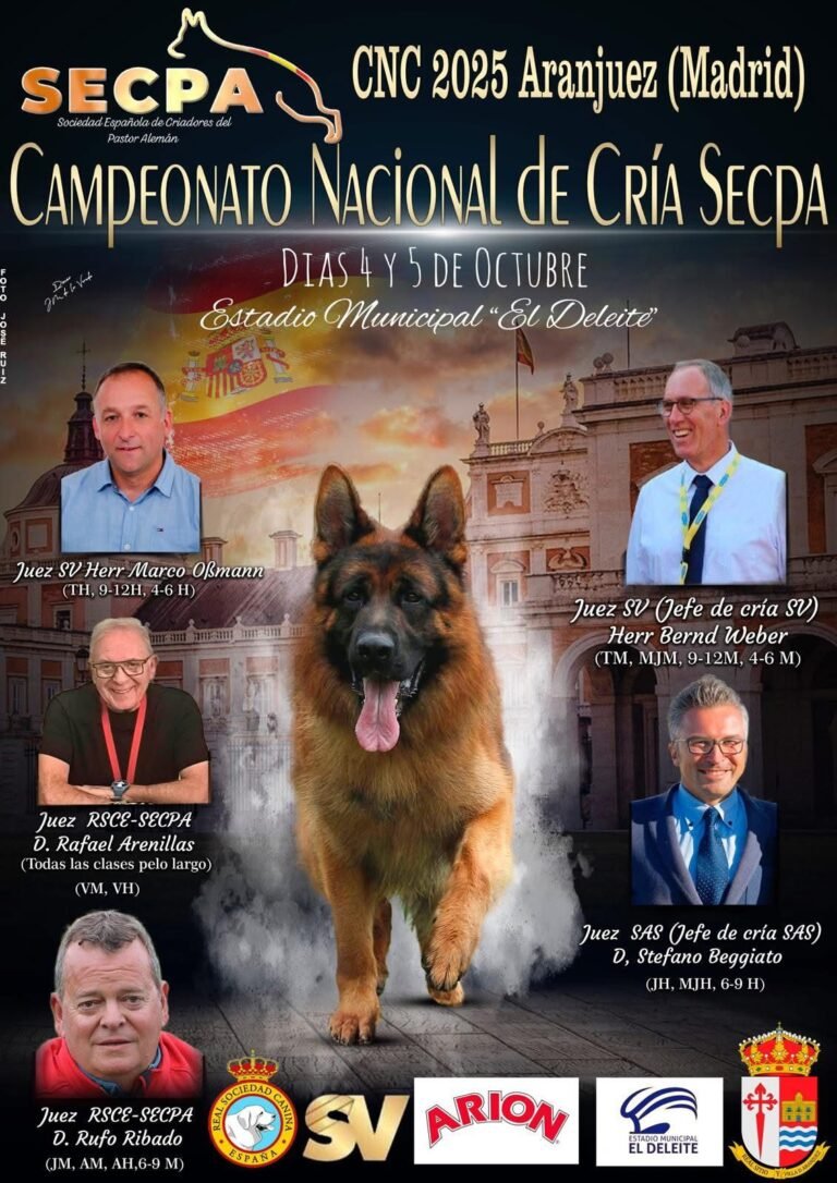 ARANJUEZ ACOGE EL CAMPEONATO NACIONAL DE CRÍA DEL PASTOR ALEMÁN (SECPA) 2025 Más de 200 ejemplares competirán los días 4 y 5 de octubre en un evento de referencia para criadores, aficionados y jueces internacionales. El evento será de acceso libre y tendrá lugar en el Estadio Municipal ‘El Deleite’. Aranjuez, 25 de septiembre de 2025 Aranjuez acogerá el sábado 4 y domingo 5 de octubre el Campeonato Nacional de Cría organizado por la Sociedad Española de Criadores de Pastor Alemán (SECPA). Se trata de un evento puntero entre los aficionados, considerándose uno de los más prestigiosos a nivel internacional. Este campeonato reúne a los mejores criadores y ejemplares previéndose una participación de más de 200 Pastores Alemanes procedentes de toda España, Alemania, Italia, Francia y Portugal. Además, contará con la presencia de jueces de gran renombre internacional como Bernd Weber, Marco Ossmann, Stefano Beggiato, Rufo Ribado y Rafael Arenillas. Durante los dos días que dura el campeonato, los jueces examinarán a los ejemplares participantes en distintas categorías organizadas por sexo, edad y tipo de pelo, con valoraciones individuales y colectivas, incluyendo pruebas específicas de trabajo y carácter. El evento, que será de acceso libre, tendrá lugar en el Estadio Municipal ‘El Deleite’ y permitirá presenciar en directo la evaluación y exhibición de algunos de los mejores Pastores Alemanes de Europa desde las 8:00 horas.