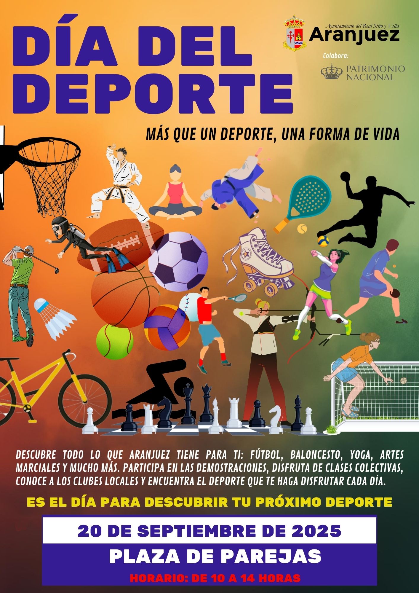 El próximo 20 de septiembre, el deporte vuelve a ser protagonista en nuestra ciudad. Entre las 10:00 y las 14:00 h, la Plaza de Parejas se llenará de actividad, energía y diversión para acoger una nueva edición del Día del Deporte en Aranjuez.