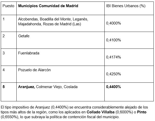 Tipos Más Bajos: Aranjuez solo es superado por un pequeño grupo de municipios. El tipo impositivo más bajo lo aplica