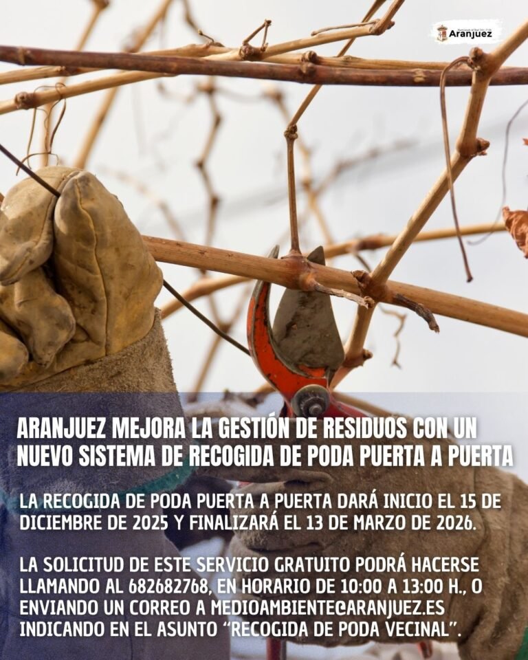 La recogida de poda puerta a puerta dará inicio el 15 de diciembre de 2025 y finalizará el 13 de marzo de 2026. Las diferentes localizaciones de zonificación de retirada serán: La Montaña, Narváez, Jardines del Deleite, El Pinar de Aranjuez y El Vergel, El Mirador, Ciudad de las Artes, Agfa y Colonia de Aviación, Calle de la Reina y Cortijo de San Isidro.