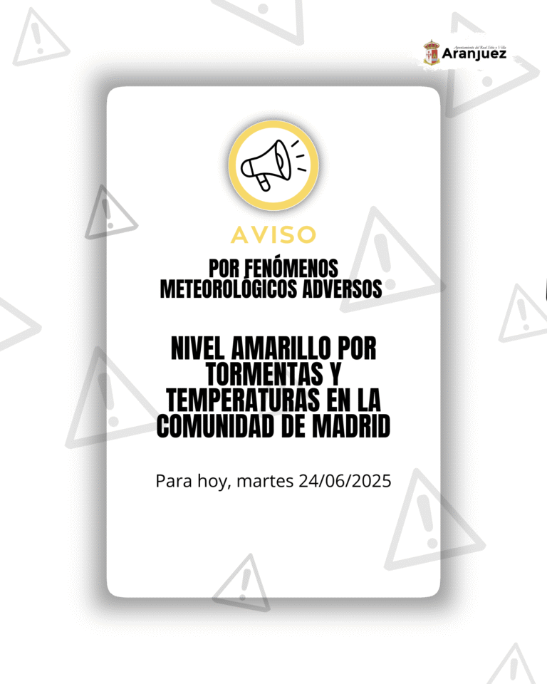 En el ámbito geográfico Madrid (Sur, Vegas y Oeste) el aviso amarillo es por Tormentas (Hora de comienzo: 16:00 hora oficial del 21/06/2025) y por Temperatura máxima 37ºC (Hora de comienzo: 13:00 hora oficial del 21/06/2025).