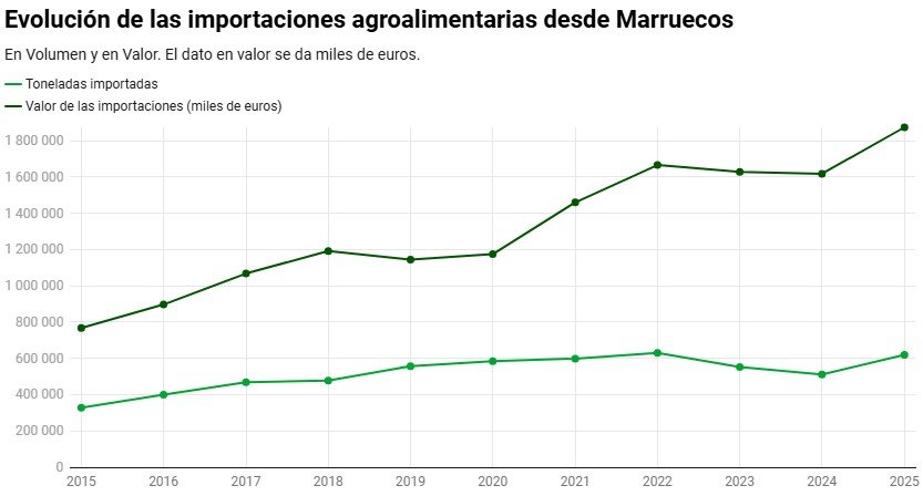 En volumen, el crecimiento es de un 88%, al pasar de 327.939 toneladas importadas de dicha categoría a 618.888 toneladas. En este sentido, no ha sido el año de mayor récord, ya que en 2022 se compraron a Marruecos 630.016 toneladas, aunque por ‘solo’ 1.665 millones de euros (menos que el coste de las importaciones en 2025).
