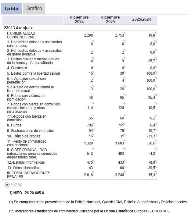 Aranjuez 23 febrero 2026. Los datos de seguridad ciudadana al cierre del ejercicio arrojan cifras que han encendido las alarmas en el municipio. Según el informe del Ministerio del Interior, Aranjuez ha experimentado un incremento notable en delitos de alto impacto social, rompiendo la tendencia de contención de periodos anteriores.