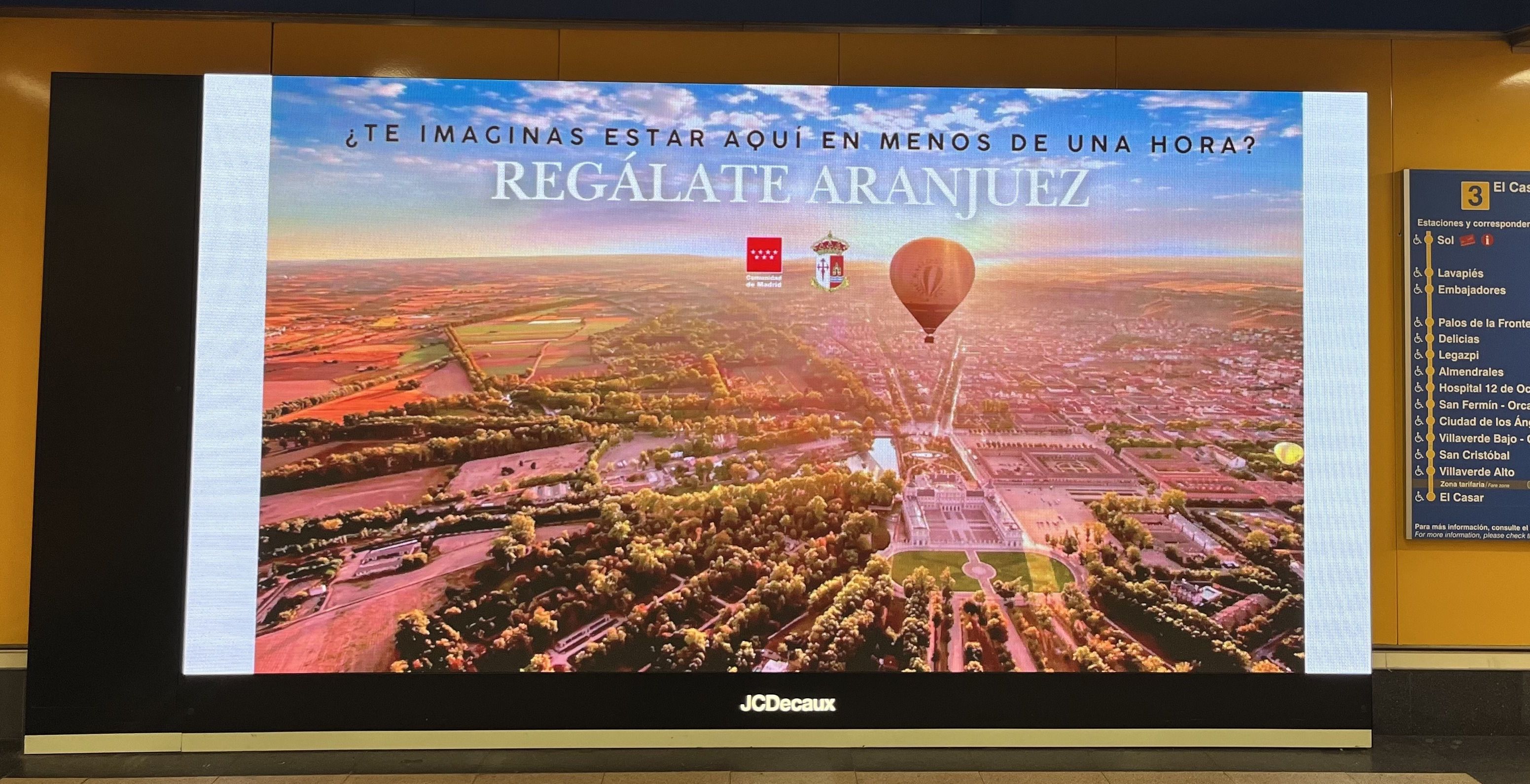 La campaña, que se estima alcanzará los casi dos millones de impactos, estará vigente del 21 al 30 de noviembre y consiste en la difusión de la imagen de Aranjuez en las pantallas de los andenes de Metro de Madrid, con un tamaño aproximado de 6 a 8 metros cuadrados.