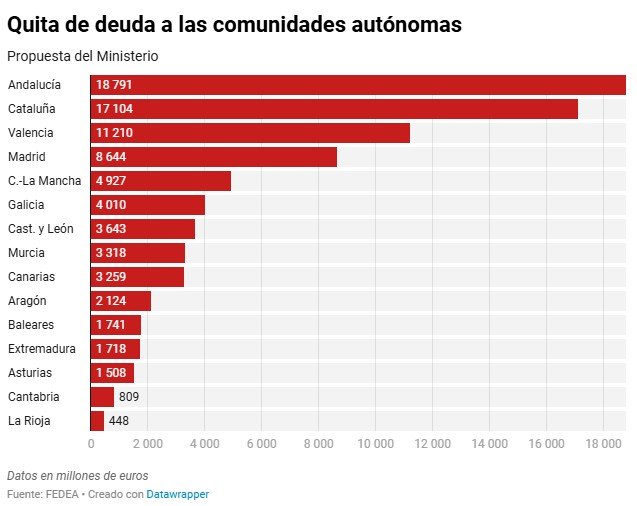 La propuesta del departamento de María Jesús Montero beneficia a primera vista a Andalucía, a la que se adjudicaría la mayor cuantía: 18.791 millones de euros. Y, en segundo lugar, a Cataluña, con 17.104 millones. Un golpe de efecto con el que Montero, también candidata del PSOE a la Junta de Andalucía, trató de camuflar que la medida, exigida por ERC para investir a Pedro Sánchez, fuera una dádiva más al separatismo.