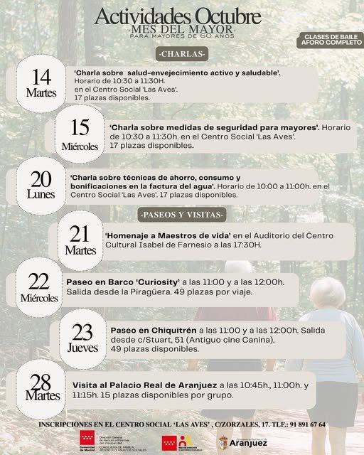 15 de octubre → ‘Charla sobre medidas de seguridad para mayores’. De 10:30 a 11:30h. en el Centro Social ‘Las Aves’. 17 plazas disponibles.