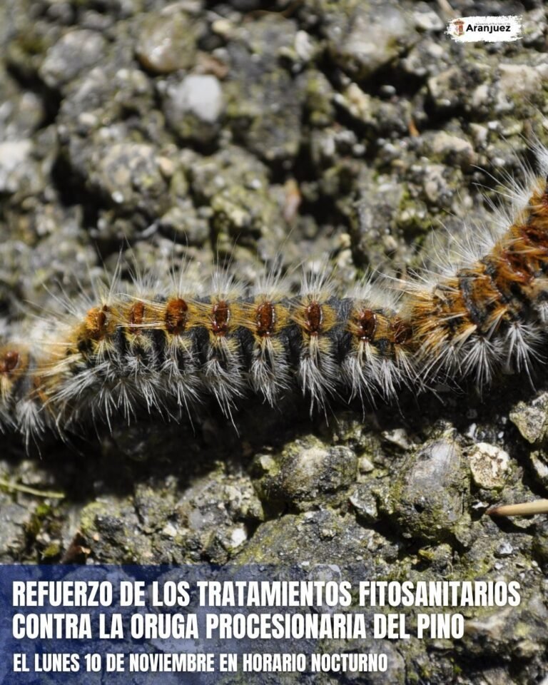 El Ayuntamiento de Aranjuez, a través de la Delegación de Proyectos e Infraestructuras Verde y Azul, comunica que se llevará a cabo un segundo pase de tratamiento contra la oruga procesionaria del pino, el próximo lunes 10 de noviembre.