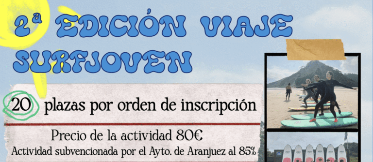‘SURFJOVEN 2025’: SURF, NATURALEZA Y CONVIVENCIA EN ASTURIAS PARA ESTUDIANTES DE 4º DE LA ESO   El programa incluye transporte, alojamiento, pensión completa, clases de surf y actividades en la naturaleza, como espeleología. El viaje está programado del 10 al 13 de octubre y financiado al 85 % por el Ayuntamiento, con un coste final de solo 80 euros por participante. Las inscripciones se abrirán el 29 de septiembre en la Delegación de Juventud, con un total de 20 plazas disponibles.   CARTEL SURFJOVEN 2025   Aranjuez, 24 de septiembre de 2025 El Ayuntamiento de Aranjuez, a través de la Delegación de Juventud e Infancia, presenta ‘SufJoven 2025’. En esta segunda edición, el destino será Llanes, Asturias, y contará con transporte, alojamiento, pensión completa y clases de surf, a lo que se sumarán actividades en la naturaleza, como espeleología. El viaje está programado del 10 al 13 de octubre y dirigido a alumnos de 4º de la ESO. Hay un total de 20 plazas disponibles, y las inscripciones se han de realizar de forma presencial, a partir del 29 de septiembre y hasta agotar plazas, en la Delegación de Juventud, ubicada en el Centro Cultural Isabel de Farnesio -Calle Capitán, 39-, en horario de lunes a viernes, de 09:00 a 14:00 horas, y jueves de 16:00 a 18:30 horas. ‘SufJoven 2025’ está financiado al 85 % por el Ayuntamiento de Aranjuez, por lo que los participantes sólo tendrán que abonar 80 euros por el viaje, que incluye: transporte, alojamiento, pensión completa, clases de surf, talleres y monitor 24 horas. Más información: juventud@aranjuez.es, 91 891 03 60, EXT 1412. “Estamos muy contentos de poder repetir esta actividad, que ofrece a nuestros jóvenes una alternativa de ocio saludable y les permite acercarse a un deporte apasionante como es el surf, al tiempo que disfrutan de la naturaleza y de la convivencia en grupo”, afirma la Delegada de Juventud e Infancia, María Eugenia Pérez Cervera.